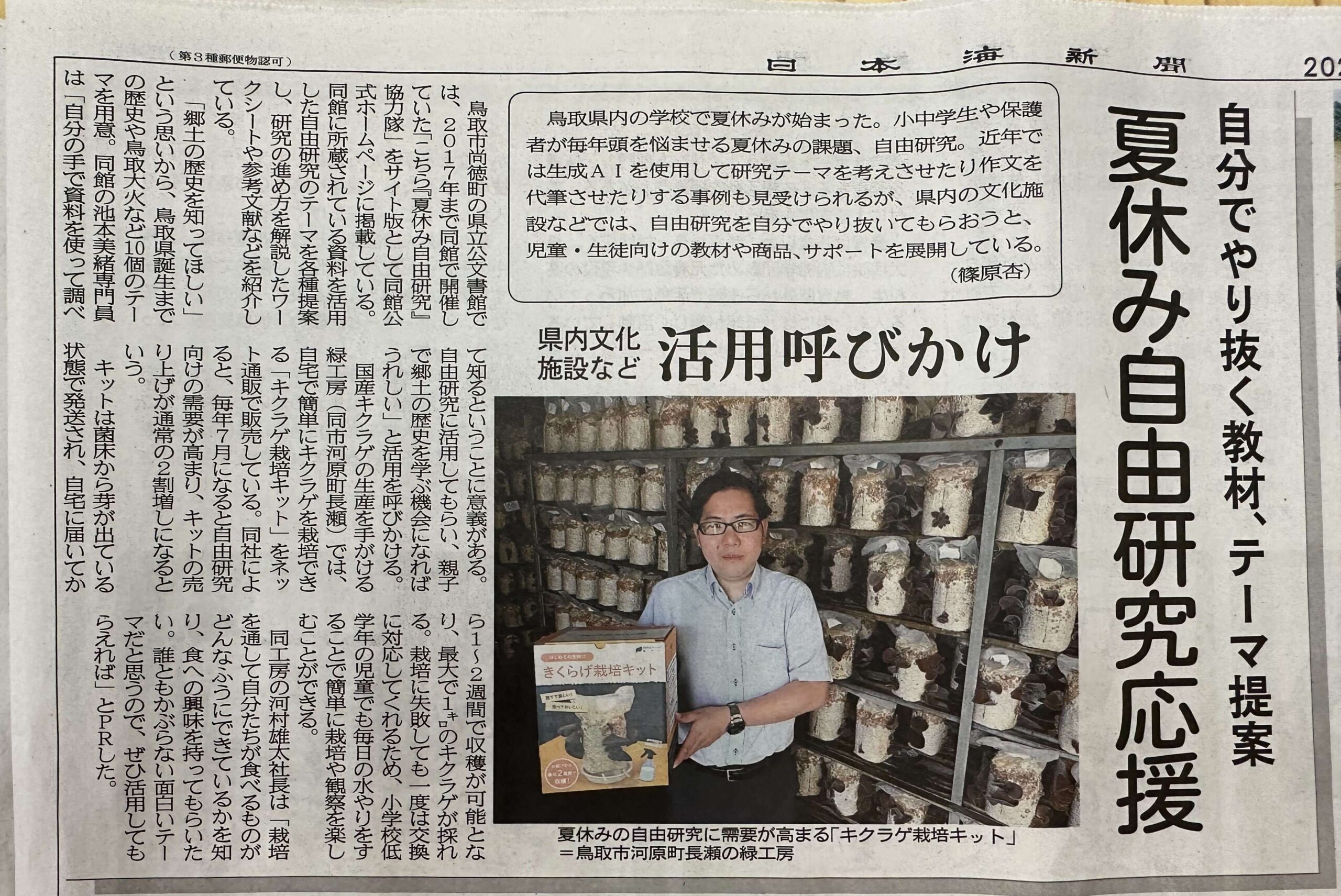 7月27日の日本海新聞にて、緑工房のはじめての方向け きくらげ栽培キットが紹介されました。